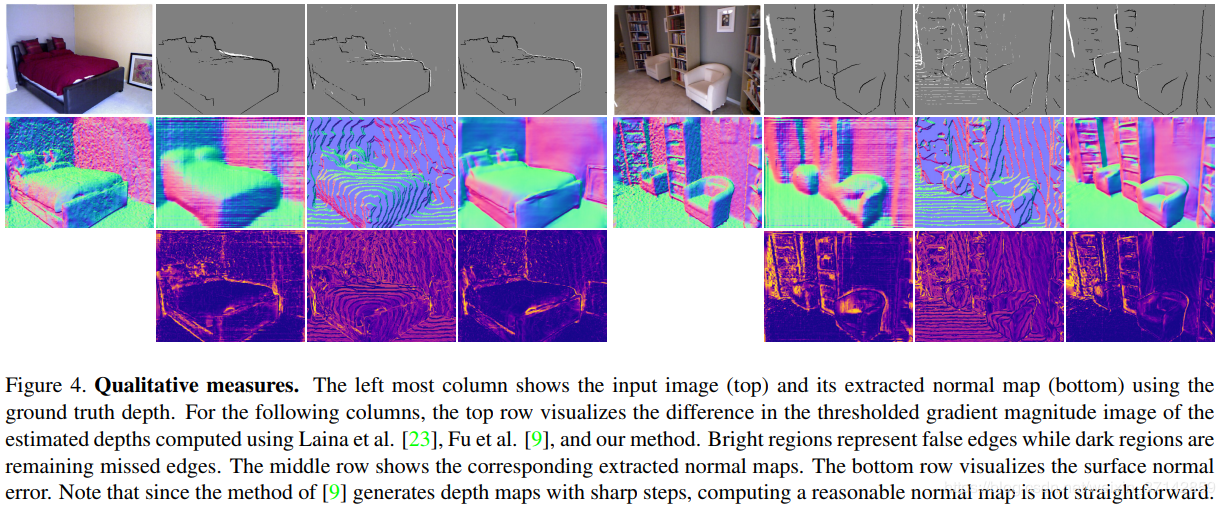 很多CNNs网络的方法将视为从RGB图像映射到深度图的回归问题[7, 23, 37, 14, 38, 9]。尽管这些模型的效果稳步提升,但在深度图的质量和分辨率上仍然有很大的改进空间。本文的目的是使用典型的神经网络结构,生成质量更高、边界更准确的深度图。我们的初步结果表明,通过利用在其他计算机视觉任务上表现良好的现有简单架构,可以实现对最新技术的改进。