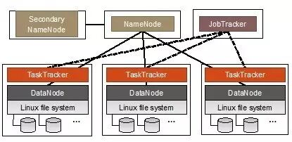 正常工作的Hadoop集群中,在网络分布的不同服务器上运行着一组守护进程,分别是NameNode(名字节点)、DataNode(数据节点)、SecondaryNameNode(次名字节点)、JobTracker(作业跟踪节点)和TaskTracker(任务跟踪节点)。