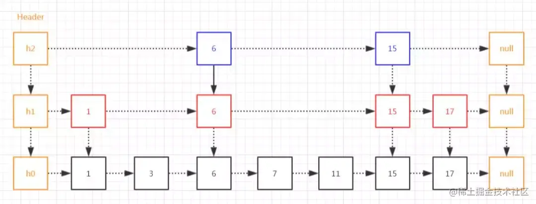 - 跳表在原有的有序链表上增加了多级索引,通过索引来实现快速查找